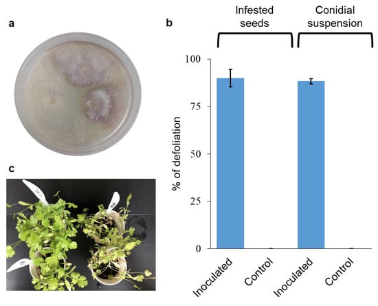 Fusarium oxysporum inoculation of coriander. (a) Isolation of F. oxysporum from infected plants from Magen Shaul. (b) Level of disease in coriander plants upon inoculation with F. oxysporum isolate using two different inoculation methods: infested seeds as inoculum carriers, and conidial suspension. Values are mean of 3–4 pots, respectively, ±SEM. (c) The status of the plants at the end of the experiment.