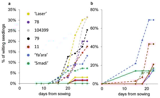 Another two experiments were conducted where the percentages of wilted seedlings out of the total germinated seedlings were measured. In the first experiment, after 28 days, ‘Smadi’ and, to a certain level, ‘Ya’ara’, outperformed the breeding lines and the commercial cultivar ‘Laser’ (Figure 5a). Again, the first wilting seedlings were observed roughly two weeks after sowing. In the second experiment, ‘Smadi’ reached less than 20% wilted plants, similar to the results in the sterilized soil after only 23 days (Figure 5b). In this experiment, ‘Ya’ara’ reached almost 70% wilted seedlings, and line 11 reached 43% wilted seedlings.