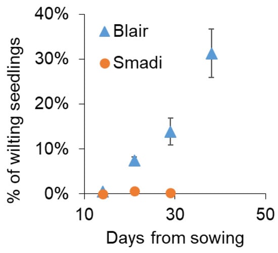 Field experiment in naturally infested soil. The cultivars ‘Smadi’ and ‘Blair’ were sown in naturally infested soil on 5 June 2023 near Magen Shaul. Percentages of wilted plants out of the germinated plants were inspected counted/determined manually in 360 cm2. Data shown are the mean of eight plots of each cultivar ± SEM.