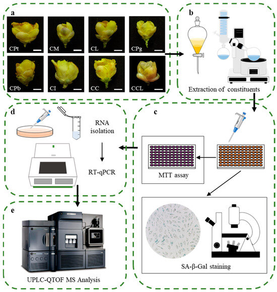 Overview of the workflow for anti-senescence-activity screening of the C. Sect. Chrysantha Chang chemical constituents. (a) Eight species in C. Sect. Chrysantha Chang: CPt, C. petelotii var. grandiflora; CM, C. multipetala; CL, C. longzhouensis; CPg, C. pingguoensis; CPb, C. pubipetala; CI, C. impressinervis; CC, C. chrysantha (Hu); CCL, C. chrysantha var. longistyla. Scale bar = 1 cm. (b) Constituents extraction and concentration. (c) The anti-senescence activity of extracts assessed via MTT assay and SA-β-Gal staining. (d) Extracts altered expression level of genes associated with senescence. (e) Identification of chemical constituents.