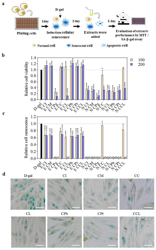 The anti-senescence effect of ethyl acetate and n-butanol extracts of flowers from eight species in C. Sect. Chrysantha Chang in D-gal-induced senescent cells: (a) experimental workflow; (b) relative cell viability; (c) relative cell senescence; (d) cells treated with ethyl acetate extracts at a concentration of 100 μg·mL−1 stained for SA-β-Gal. Scale bar = 100 μm. * p < 0.05 vs. D-gal, ** p < 0.01 vs. D-gal, *** p < 0.001 vs. D-gal, nd = not detected, three biological replicates. E, ethyl acetate extract; N, n-butanol extract; CI, C. impressinervis; CM, C. multipetala; CPg, C. pingguoensis; CC, C. chrysantha (Hu); CL, C. longzhouensis; CPb, C. pubipetala; CPt, C. petelotii var. grandiflora; CCL, C. chrysantha var. longistyla.