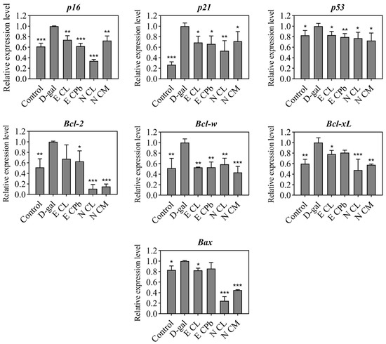 Relative expression levels of cell-senescence-associated genes and Bcl-2 family genes in D-gal-induced senescent cells. The senescent cells were treated with ethyl acetate extracts of CL and CPb and n-butanol extracts of CL and CM, and gene expression levels of senescence-related genes and apoptosis-associated genes were detected via QRT-PCR. * p < 0.05 vs. D-gal, ** p < 0.01 vs. D-gal, *** p < 0.001 vs. D-gal, three biological replicates. E, ethyl acetate extract; N, n-butanol extract; CL, C. longzhouensis; CPb, C. pubipetala; CM, C. multipetala.