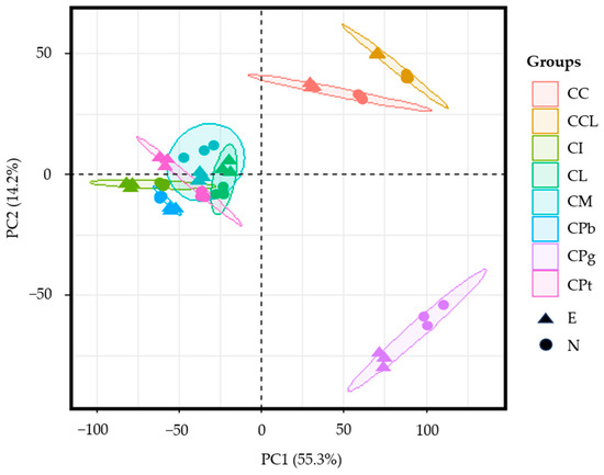 PCA score plot for ethyl acetate and n-butanol extracts of eight different C. Sect. Chrysantha Chang flowers based on 279 molecular features detected in ESI-. E, ethyl acetate extract; N, n-butanol extract; CPg, C. pingguoensis; CI, C. impressinervis; CPb, C. pubipetala; CPt, C. petelotii var. grandiflora; CL, C. longzhouensis; CM, C. multipetala; CCL, C. chrysantha var. longistyla; and CC, C. chrysantha (Hu).