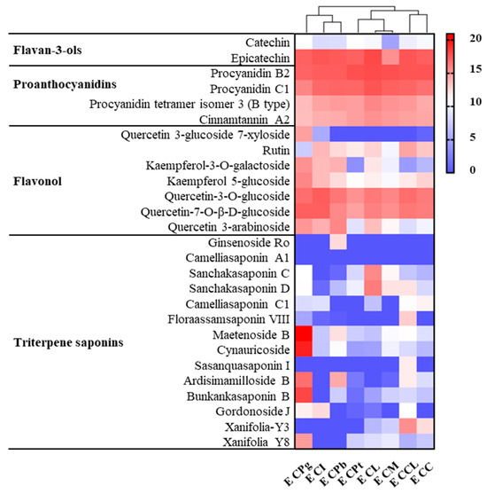 The saponin extracted from these C. Sect. Chrysantha Chang species were enriched in the n-butanol fraction (Figure 7). Epicatechin, quercetin-7-O-β-D-glucoside, quercetin-3-O-glucoside, and four proanthocyanidins were abundant across all eight species. Quercetin 3-glucoside 7-xyloside, kaempferol-3-O-galactoside, and kaempferol 5-glucoside were relatively high in CPg. And the content of rutin in CPg was lower than that in the other seven species. There were minor differences between the ethyl acetate and n-butanol extracts in terms of the content of flavan-3-ols, proanthocyanidins, and flavonol. Ginsenoside Ro was uniquely presented in CPb, whereas camelliasaponin A1 reached its peak abundance in this species. Sanchakasaponin C and sanchakasaponin D were significantly abundant in CL, CM, and CPt, with less but still notable amounts in CC and CPg. We could also observe that xanifolia-Y8, cynauricoside, maetenoside B, ardisimamilloside B, and bunkankasaponin B were extremely abundant in CPg. Ardisimamilloside B and gordonoside J levels were relatively high in CPb and CC, respectively. The cluster analysis showed that the compositions of CPt, CL, and CM were relatively close. CI, CPb, CCL, and CC were clustered, respectively, while CPg diverged distinctly from the other seven species.