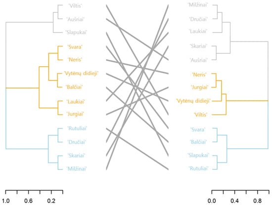 UPGMA cluster analysis was performed using 12 morphological traits and seven SSR primers to assess the genetic diversity of tomato varieties. In the dendrogram and tanglegram, the varieties were divided into three main groups (Figure 2). The cluster of varieties according to morphological traits does not correspond to clustering according to molecular data. According to the grouping of varieties in both dendrograms, the closest relations between morphological and molecular data are for varieties ‘Vytėnų didieji’, ‘Neris’, ‘Aušriai’, ‘Balčiai’ and ‘Rutuliai’.