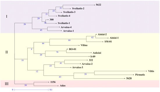In the UPGMA dendrogram, the Lithuanian tomato hybrids and their parental forms were grouped into three main groups (Figure 3). The grouping of hybrids is related to the parental forms; all genotypes of hybrid ‘Sveikutis’ were grouped in the same group in tandem with both parental forms, namely 5622 and 300 (Table 1). Two hybrid ‘Arvaisa’ genotypes were separated by having the same parental form 300 in the same group. Two other genotypes of hybrids ‘Arvaisa’ belonged to the second group of dendrogram as the molecular fingerprints were more similar to the maternal parental form 322. In this group, one subgroup consisted of hybrid ‘Pirmutis’ and both parental forms 5628 and ‘Viltis’. Two other subgroups of the second cluster were built consistently of (1) hybrid ‘Auksiai’ and parental forms BO-01 and S-09, and (2) both genotypes of hybrid ‘Ainiai’ and parental forms ‘Vilina’ and SM01. The last group of dendrogram consisted of separated hybrid ‘Adas’ with the maternal form 1156.