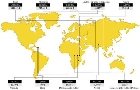 Area (hectares (ha)) and production (tonnes (T)) of major pigeonpea producing countries [2].