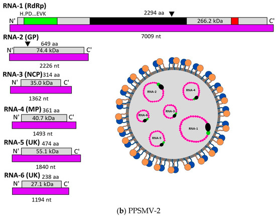 Schematic representation of PPSMV-1 (a) and PPSMV-2 (b) virus structures and RNA particles. PPSMV-1 is composed of 4 RNA segments, and PPSMV-2 is composed of six RNA segments. RNA-1 encodes for polymerase protein (RdRp), RNA-2 encodes for glycoprotein (GP) cleavage site denoted by black triangles, RNA-3 encodes for nucleocapsid protein (NCP), and RNA-4 encodes for movement protein (MP). RNA-5 and RNA-6 of PPSMV-2 encodes for proteins with unknown (UK) function. RdRp of both the viruses are similar, showing the location of endonuclease (green), Bunya RdRp (black), and proposed cap-binding site (red) subunits (pictures are reproduced [25]).