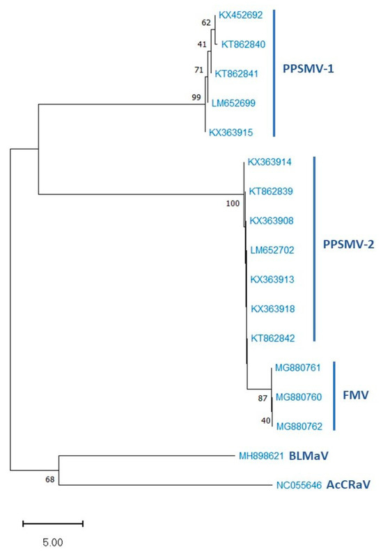 2.4. PPSMV Genome Organization and Genetic Relationship