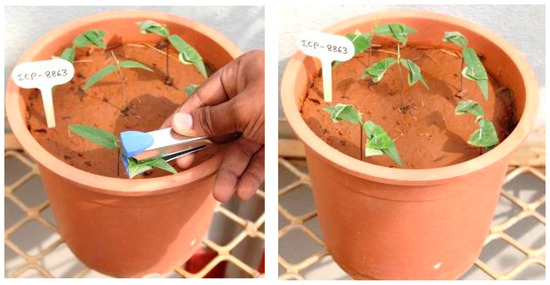 The leaf stapling technique developed by Nene and Reddy [73,74] allows the rapid screening of pigeonpea genotypes under both field and glasshouse conditions. Young SMD-infected leaflets from susceptible genotype (e.g., ICP8863) collected in a moist cloth bag were observed for mite infestation to ensure a minimum of 10 mites per leaf. The mite-infested leaflets were then stapled onto test plants at the two- to three-leaf stage in such a way that the undersurface of the diseased leaflet comes in contact with both surfaces of the test plant by folding, anchoring mites for transfer. The feeding of these mites results in PPSMV transmission onto the test plant (Figure 6). Test genotypes are subsequently observed for initial disease symptom development, and the observations were taken 60 days after planting.