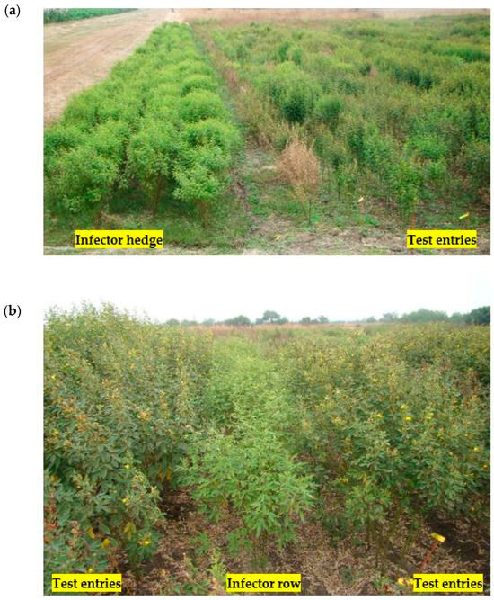(a) Infector-hedge method (4–5 rows) of screening for sterility mosaic disease resistance. (b). Infector-row method (10:1) of screening for sterility mosaic disease resistance.