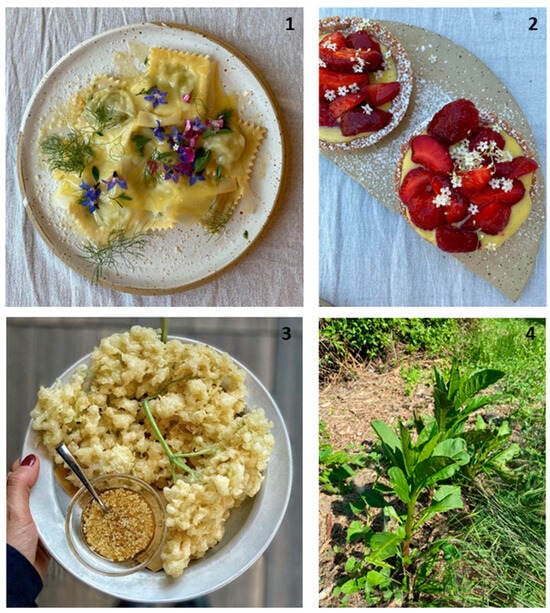 Figure 1. Wild vegetable-based dishes. 1: Tortelli filled with seirass (ricotta cheese) and Taraxacum officinale, garnished with Borago officinalis and Sambucus nigra flowers and leaves of (cultivated) fennel. 2: Pastry prepared with strawberries and Sambucus nigra flowers. 3: Deep-fried flowers of Sambucus nigra. 4: Phytolacca americana where young shoots are used for dessert. (Photo credits: S.B. and C.N.).