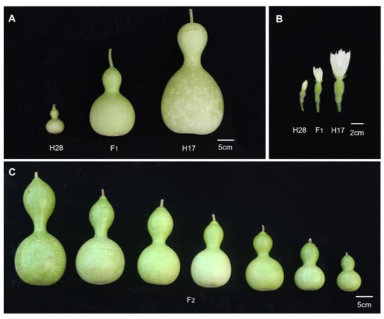 Bottle gourd fruits: male H28, female H17, their F1, and some F2. (A) Mature fruit of parent and F1. (B) Ovary of parent and F1. (C) Mature fruit of some F2.