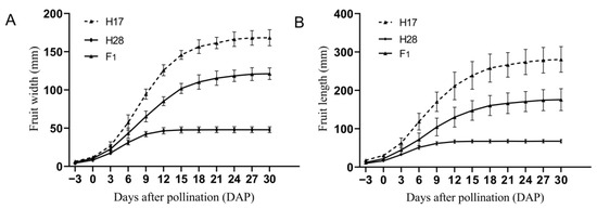 Fruits at full maturity (40 DAP) were selected, and their transverse diameter (maximum width of the fruit) and longitudinal diameter (length of the fruit from top to bottom) were measured using an electronic vernier caliper with an accuracy of 0.01 mm. These measurements were used to evaluate the mature fruit size of H28 and H17, with three fruits measured per plant to calculate the average value. Additionally, parental fruits were collected at twelve developmental stages: −3, 0, 3, 6, 9, 12, 15, 18, 21, 24, 27, and 30 days after pollination (DAP). The width and length of the parent fruits were measured at each stage to compare dynamic size changes during fruit development, with three fruits measured to obtain an average in each period.