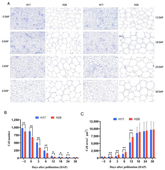 Microscopic observation and comparison of the average cell area and number in transverse sections of H17 and H28 fruit at different periods. (A) Paraffin section of H17 and H28 fruit from −3 DAP to 30 DAP; bar = 50 μm. (B) Statistical diagram of cell number. (C) Statistical diagram of cell area. *, p < 0.05; **, p < 0.01.