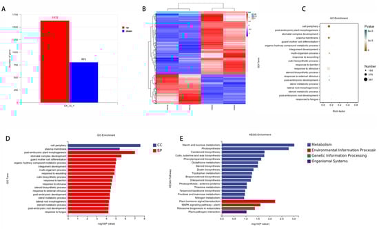 Transcriptomic analysis of fruit size of H28 and H17. (A) Number of DEGs. (B) Heat map showing the expression pattern of genes in blue and red tissues. Horizontal represents genes and each column represents a sample, with red representing highly expressed genes and green representing low-expressed genes. (C) Rich factor of GO enrichment analysis of DEGs. (D) Histogram of GO enrichment analysis of DEGs. (E) Histogram of KEGG enrichment analysis of DEGs.