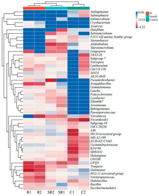 As shown in Figure 2, the samples in the restored areas were mainly dominated by Marine Group II (76.17–81.49%) and Candidatus Nitrososphaera (6.07–9.75%), with Halogranum and Candidatus Nitrocosmicus accounting for a certain percentage of samples in R1 and R2, respectively. The semi-restored areas were dominated by marine samples (6.07–9.75%). Samples from the semi-restored areas were dominated by Marine Group II (35.64–42.26%) and Candidatus Nitrososphaera (10.92–15.20%). Among these, Haladaptatus was also present in SR1 (8.27%), whereas Candidatus Nitrocosmicus (18.08%) and Natronococcus (8.19%) were more dominant in SR2. In the unrestored area, C1 was dominated by Halostagnicola (52.15%), Haloterrigena (11.76%), and Halomicrobium (8.65%), while C2 was dominated by Candidatus Nitrosopumilus (26.45%), Marine Group II (23.11%), Aenigmarchaeota (9.87%), and Natronomonas (7.21%). The above results indicate that targeted enrichment of archaea was effectively promoted in the restored soil and that the differences in the flora in the soil of the restored area were small, while there were large differences among the archaea in the soil of the unrestored areas.