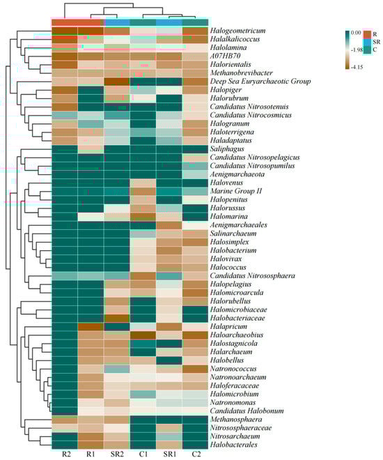 High-throughput assays of archaea in the study area. R1, R2: restored areas; SR1, SR2: semi-restored areas; C1, C2: unrestored control areas in the Xinjiang Gobi. R: restored area; SR: semi-restored area; C: unrestored control area in the Xinjiang Gobi. In the figure, the samples are UPGMA-clustered according to the Euclidean distances between the species. Species are clustered via UPGMA clustering. The data in the figure are shown on a logarithmic scale.