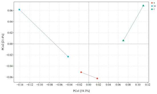 Principal coordinate analysis of archaea. R: restored area; SR: semi-restored area; C: unrestored control area in the Xinjiang Gobi.