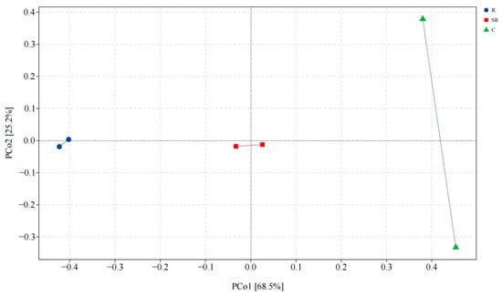 Principal coordinate analysis of bacteria. R: restored area; SR: semi-restored area; C: unrestored control area in the Xinjiang Gobi.