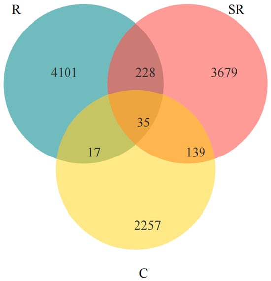 A Venn analysis based on different restoration statuses revealed the number of archaeal OTUs in each. R: restored area; SR: semi-restored area; C: unrestored control area in the Xinjiang Gobi.