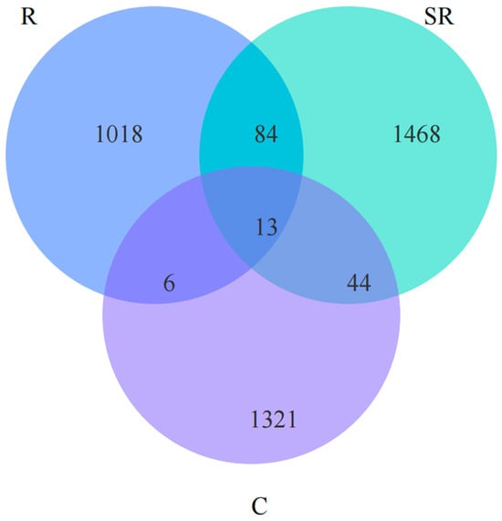 A Venn analysis based on different restoration statuses revealed the number of bacterial OTUs in each. R: restored area; SR: semi-restored area; C: unrestored control area in the Xinjiang Gobi.