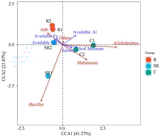 CCAs based on bacterial communitiesshowed that Halomonas, Alifodnibiu, and the soil samples from the unrestored areas were positively correlated with and strongly influenced by soil salinity and moisture, and less so by effective Al (Figure 7). The genus Bacillus was positively correlated with and strongly influenced by only the SR1 samples and negatively correlated with the effective Al content (Table 2). The restored-area samples and SR2 samples were positively correlated with the effective Mn, effective Fe, and A4b bacterial species content (Table 2). The above results indicate that there are important differences in soil salinity and water content between the unrestored adjacent area and the other areas, and the effective content of elements other than Al tended to increase after restoration.