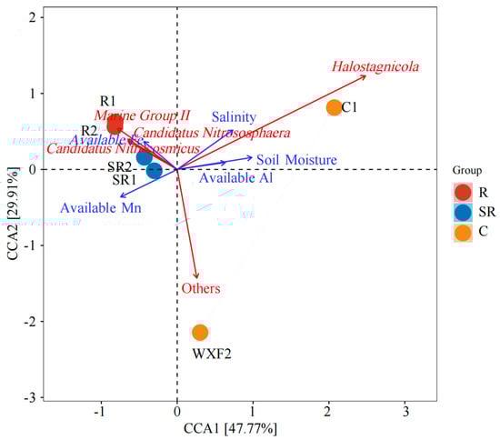 As for the archaea, the salt-tolerant bacterial taxon Marine Group II was prevalent in all samples except sample C1 []. Its abundance is often elevated in river estuaries, and it may have the ability to degrade macromolecules, according to existing studies []. However, it is not possible to speculate on function of the archaea in each sample or even whether they belong to the same genus of metabolically functional bacteria. The ammonia-oxidizing bacteria Candidatus Nitrososphaera and Candidatus Nitrocosmicus were more abundant in the remediated and semi-remediated soil samples [,], while the relative abundance of the salt-tolerant bacterium Halogranum was also higher in R1 []. The salt-tolerant bacterium Halostagnicola was mainly found in C1 [], as were Haloterrigena and Halomicrobium [,]. The ammonia-oxidizing genus Candidatus Nitrosopumilus was relatively abundant in C2 []. A comparison of the archaeal and bacterial high-throughput analyses showed that salinity was one of the main features throughout the study area. Vegetation rooting effectively alleviated bacterial growth limitation in the high-salt environment. However, the growth of archaea was relatively slow, and the restoration effect had not yet led to the establishment of an oasis covered by large areas of vegetation []. This resulted in relatively similar archaeal species and abundances and the absence of methanogenic bacteria, which are commonly found in high abundance in soils with high organic matter content. Based on these findings combined with the PCoAs, the differences between samples due to the source are the main reason. Furthermore, this also suggests that the restoration measures are the main reasons for the changes in community structure through the prevalence of salt-tolerant bacterial genera. But for the prevalence of the bacterial genus Reducibacter, this suggests that N cycling processes are abundant throughout the restored area and that nitrogen fertilization is not the central element limiting restoration in the Gobi Desert [,].