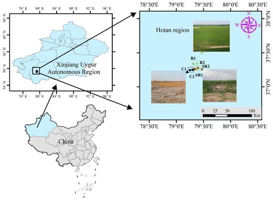 The study area was the saline and alkaline cultivated land at Xinjiang Production and Construction Corps (37°15′29″ E, 79°20′0″ N). It is a typical oasis area with self-pressurized irrigation in the inland arid zone at the edge of the Taklamakan Desert. The average annual number of sandstorms and floating and sinking days is about 220 d. To measure the restoration effect, we planted maize in this area; the depth of groundwater during the crop growth period from May to October is 1.5 to 2.0 m. According to the actual restoration scenario, a total of six typical sample sites (Figure 9) were selected for in situ surface soil sampling, including the sample sites of the fully restored areas (R1, R2), the semi-restored areas (SR1, SR2), and the unrestored control areas (C1, C2).
