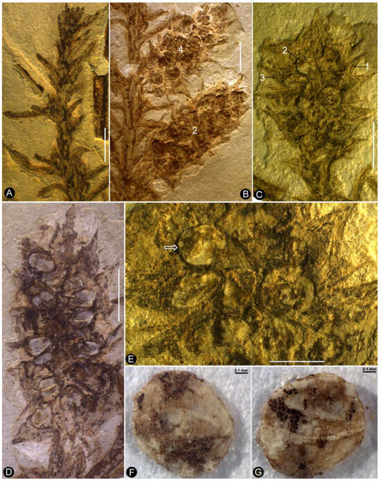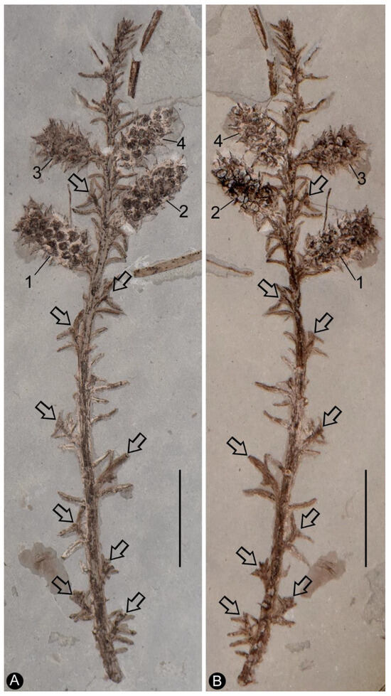 - Dong, C.; Wang, Y.D.; Yang, X.J.; Sun, B.N. Whole-plant reconstruction and updated phylogeny of Austrohamia acanthobractea (Cupressaceae) from the Middle Jurassic of Northeast China. Int. J. Plant Sci. 2018, 179, 640–662. [Google Scholar] [CrossRef]