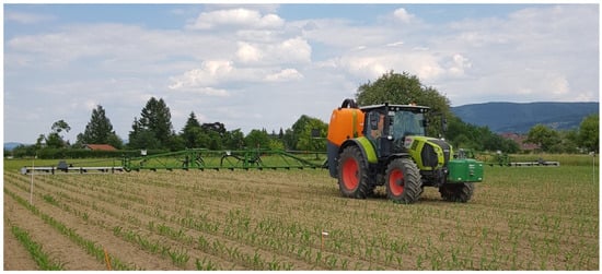 All four trials were set up in a randomized complete block design with four repetitions. Each of the four experiments contained 7 treatments. Post-emergence herbicides were applied early (Post Early), late (Post Late) and early after a pre-emergence herbicide treatment (Pre + Post). All three treatments were realized as a broadcast treatment across the whole plot (B) and as a spotting treatment for the post-emergence herbicides (S). A control treatment was included in all experiments without any weed control method (CON). For pre-emergence application, 3.5 L ha−1 Stomp Aqua® (455 g L−1 pendimethalin, EC, BASF) and 1.0 L ha−1 Spectrum® (720 g L−1 dimethenamid-P, EC, BASF) were used. Post-emergence treatments were realized with 1.5 L ha−1 MaisTer Power® (30 g L−1 foramsulfuron + 9.77 g L−1 thiencarbazone + 0.85 g L−1 iodosulfuron + 15 g L−1 cyprosulfamide, SC, Bayer CropScience (Leverkusen, Germany)). The plot size in each experiment was 3 m × 10 m, with the longer side in the sowing direction. Herbicides were sprayed with an Amazone UF 2002 (Amazone, Hasbergen, Germany) with a width of 21 m (Figure 1) and single nozzle control. The sprayer was calibrated for a volume of 220 l ha−1 water at a pressure of 2.5 bar and a speed of 6 km h−1. The boom had a height of 0.5 m above the canopy. Injector compact broadcast spray nozzles IDK 90–04 C were used (Lechler, Metzingen, Germany).