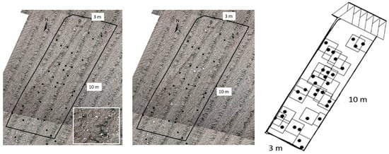 For manual weed detection, UAV images were loaded into the geographic information system ArcGIS (ESRI, Redlands, CA, USA). Images were then overlaid with the plot map. The images were manually zoomed to a spatial resolution of 1.4 mm per pixel (Figure 3 left). If weeds were detected, they were marked with their coordinates and later overlaid with the automatically classified map (Figure 3 middle). With this approach, the accuracy of CNN-based weed classification was approved.