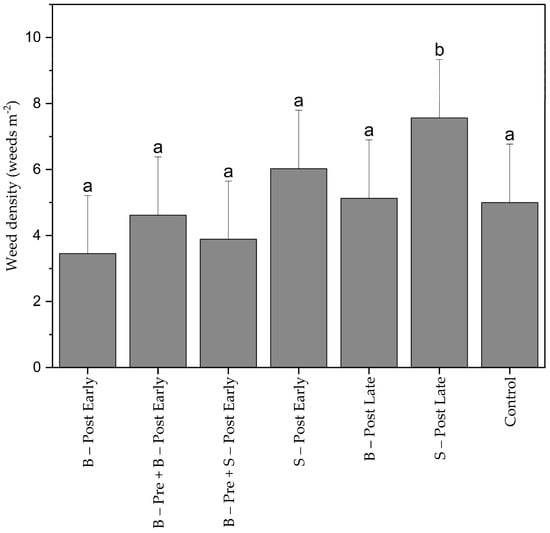 Weed density 20 DAS before early post-emergence herbicide application and spot spraying were considerably low, ranging between 3 plants m−2 (B–Post Early) and 8 plants m−2 (S–Post Late) (Figure 4). There were no significant differences between the treatments. After 40 mm of rainfall on 18 June 2023, a flash of new emerging weeds was recorded before late post-emergence weed control (B-Post Late, S-Post Late), and the untreated control plots increased weed density in the three treatments to 52 plants m−2.