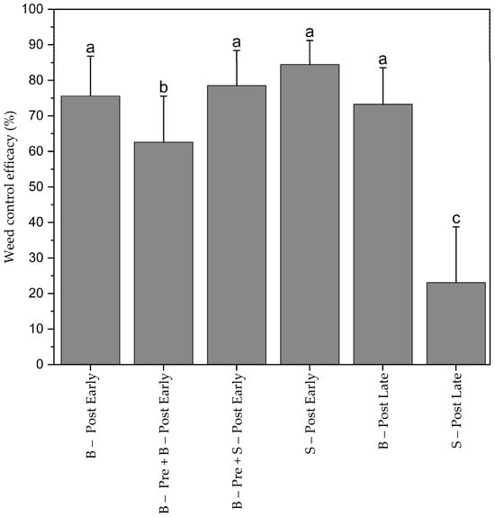Weed control efficacy (%) for all treatments. Means with the same letter are not significantly different according to HSD-test (α ≤ 0.05). Bars represent the standard error (SE) of the mean.