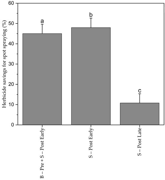 Early spotting resulted in 47% herbicide savings. Taking the misclassifications of the UAV images into account, 50% savings could have been realized with the approach in this study. The combined treatment B-Pre + S–Post Early) amounted to 44% herbicide savings (0% for the pre-emergence herbicide and 48% for post-emergence herbicide). The savings from late spotting (S–Post Late) were significantly lower, with only 12%, which was probably due to higher weed density at late post-emergence herbicide application (Figure 6).