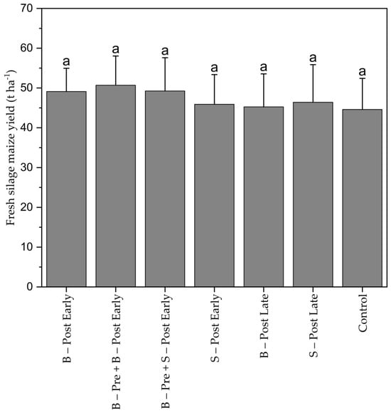Fresh silage maize yield (t ha−1) harvested from the two center rows of each plot. Means with the same letter are not significantly different according to HSD test (α ≤ 0.05). Bars represent the standard error (SE) of the mean.