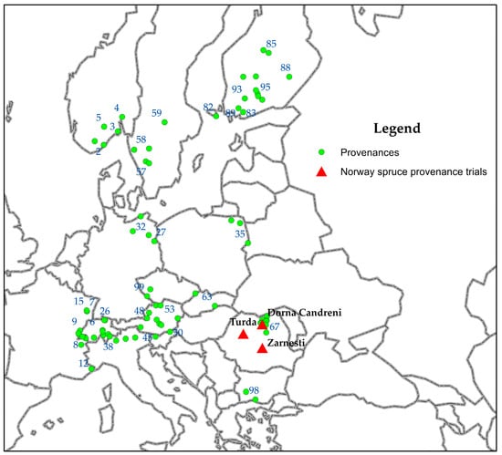 The three provenance trials from Romania, Dorna Candrenilor, Zarnesti, and Turda, analysed in this study, are in the Eastern, Southern, and Western Romanian Carpathians, respectively. The Zarnesti and Dorna Candrenilor provenance trials are in the mixed beech and coniferous species zone, while Turda is in the Norway spruce vegetation zone. The climate conditions are continental, with Scandinavian–Baltic influences in the north (Dorna Candrenilor) and temperate–continental with oceanic influence in the west (Turda) and central parts (Zarnesti) [42]. The three Norway spruce provenance trials were established in 1972 [43]. Eighty-one provenances were tested in these trials, ten from Romania and the rest from twelve other European countries (Figure 1). The geographic coordinates and details about the tested provenances are presented in Supplementary Table S1.