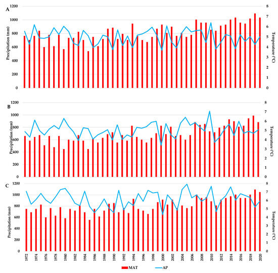 The variation in mean annual temperature (MAT) and annual precipitations (AP) for the Norway spruce provenance trials for the 1972–2020 period; (A)—Dorna Candrenilor, (B)—Turda, (C)—Zarnesti.