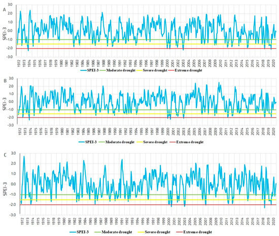 Variation in SPEI-3 for the Norway spruce provenance trials, for the period 1972–2020; (A)—Dorna Candrenilor, (B)—Turda, (C)—Zarnesti.