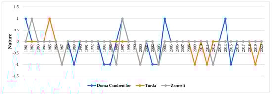 The pointer years in each Norway spruce provenance trial. A nature value of 1 means the year had a positive influence on the trees’ ring growth, while a value of −1 means the year had a negative influence on the trees’ ring growth.