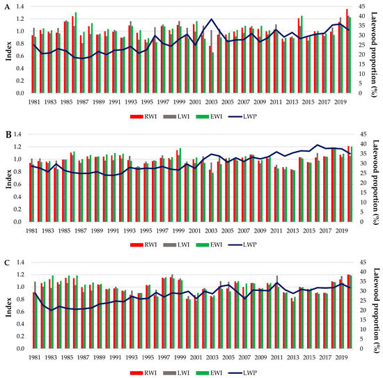 Variation in the wood traits of Norway spruce over the years for the period 1981–2020; (A)—Dorna Candrenilor, (B)—Turda, (C)—Zarnesti. RWI –ring width index; EWI –earlywood width index; LWI—latewood width index; LWP—latewood percentage.