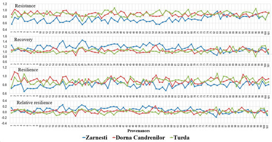 Analysing the provenances’ different responses to the drought from the year 2000 (Figure 6), significant differences were found between the provenances for all tree resilience indices in the Zarnesti trial. At the Turda trial, the differences were significant for all indices, except resilience, while at Dorna Candrenilor, resilience was the only factor with significant differences between provenances (Table 4).