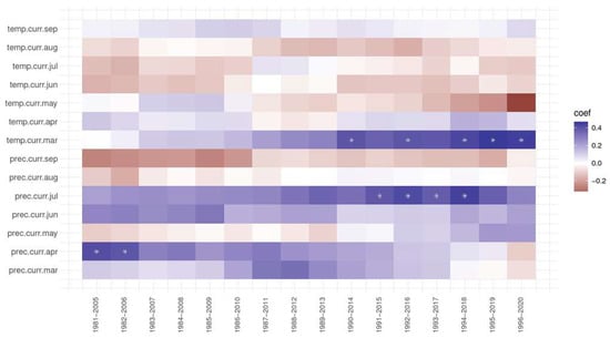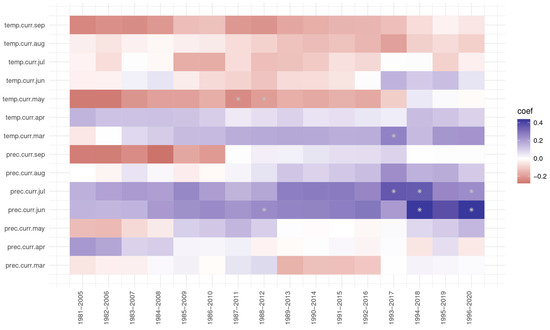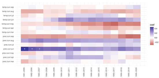 At the Zarnesti trial, precipitation in June was significant for the first three periods of 1981–2007 (Figure 8); the value of the correlation coefficient, while still positive, was decreasing. Precipitation from September and the temperature in May, while not significant, had a negative impact but became stronger in the last periods (three and four, respectively).