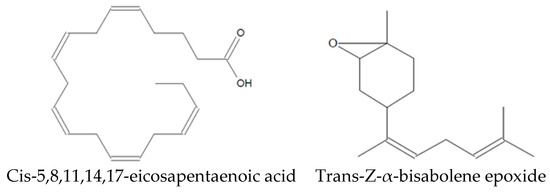 | 13 | 32.9 | Methyl octadeca-13,16-diynoate | 13,16-Octadecadiynoic acid, methyl ester | C19H30O2 | 290.4 | 74 | FA |