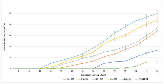 Incidence of P. peregrina seeds with a ruptured coat (%), depending on the applied GA3 concentration. Error bars indicate the standard error (n = 3).