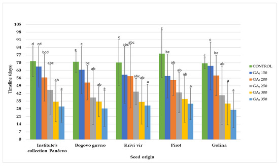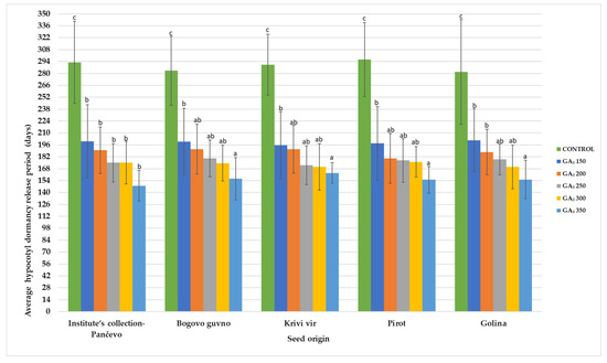 Period required for hypocotyl dormancy release in P. peregrina seeds of various origins, depending on the applied GA3 concentration. Differences were evaluated by two-way analysis of variance (ANOVA) completed with Duncan’s test (p ≤ 0.05). Different letters (a–c) indicate significant differences (p ≤ 0.05). Error bars indicate standard deviations (n = 3).