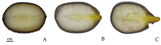 Cross-sectional view of the Paeonia peregrina embryo developmental stages: (A) fresh seed; (B) seed coat rupture; (C) radicle protrusion.