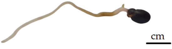 The incidence of the stage defined as a ruptured seed coat depended on the applied GA3 concentrations (Figure 1). The impact of GA3 application on accelerating seed germination was detected. Each 50 mg L−1 increase in GA3 concentration accelerated seed germination by approximately 10 days. The 300 and 350 mg L−1 GA3 initiated coat rapturing after a month. In control C1 (seeds immersed in sterile distilled water—SDW), the seed coats started to rupture after 70 days. In the treatment with 350 mg L−1 GA3, on average, 100% of the seeds had a ruptured coat after 100 days, while control C1 reached only 12%. In control C2 (seeds without imbibition), none of the seeds had a ruptured coat in the first 100 days. The 350 mg L−1 GA3 concentration was 65.3% and 88.0% more efficient than the lowest GA3 concentration (150 mg L−1 GA3) and C1, respectively (Figure 1). Two weeks after initiated coat rapturing the radicle begin to emerge (Figure 2).