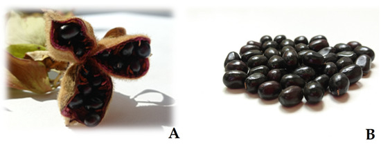 Paeonia peregrina: (A) mature pods with seeds; (B) mature seeds.
