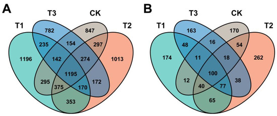 A total of 12 rhizosphere soil samples were subjected to an Illumina NovaSeq platform to generate 16S and ITS paired-end sequencing. The data collected from Illumina sequencing were processed for quality control, barcode and primer sequences removal, and chimeras removal to obtain clean data. The data related to raw reads, effective tags, Q20 and 30, and effective tag (%) of 16S and ITS gene sequencing are shown in Tables S1 and S2. Amplicon sequence variants (ASVs) obtained through DADA2 analysis clustered clean data at a 100% sequence similarity level for taxonomic annotation. The ASV results of bacteria and fungi after denoise were classified into common and unique ASVs according to different treatments, as shown in the Venn diagram (Figure 1). Analysis of ASVs showed a total of 7500 bacterial ASVs, including 3961 in T1, 3849 in T2, 3124 in T3, and 3579 in CK, were found under different treatments. Among them, 1196, 1013, 782, and 847 ASVs were unique in T1, T2, T3, and CK, respectively, and 1195 ASVs were common in all treatments (Figure 1A). A total of 1248 fungal ASVs were recovered, of which 527, 654, 417, and 174 ASVs belonged to T1, T2, T3, and CK, respectively. Furthermore, ASV analysis showed that 174, 262, 163, and 170 were recovered as unique ASVs in T1, T2, T3, and CK, respectively, with 100 ASVs as common among all treatments (Figure 1B). Then, we annotated the species classification of bacteria and fungi based on all ASVs and investigated the phylogenetic relationships of the top 100 representative sequences at the genus level through multiple sequence alignment, respectively (Figure S1A,B).